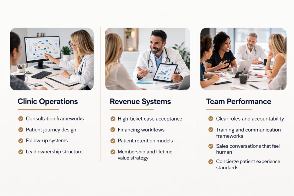 ScaleCo installs consultation frameworks, patient journey systems, and operational structures that help growth-focused clinics scale $25K–$100K+ in monthly revenue — without ever losing the heart of the work.